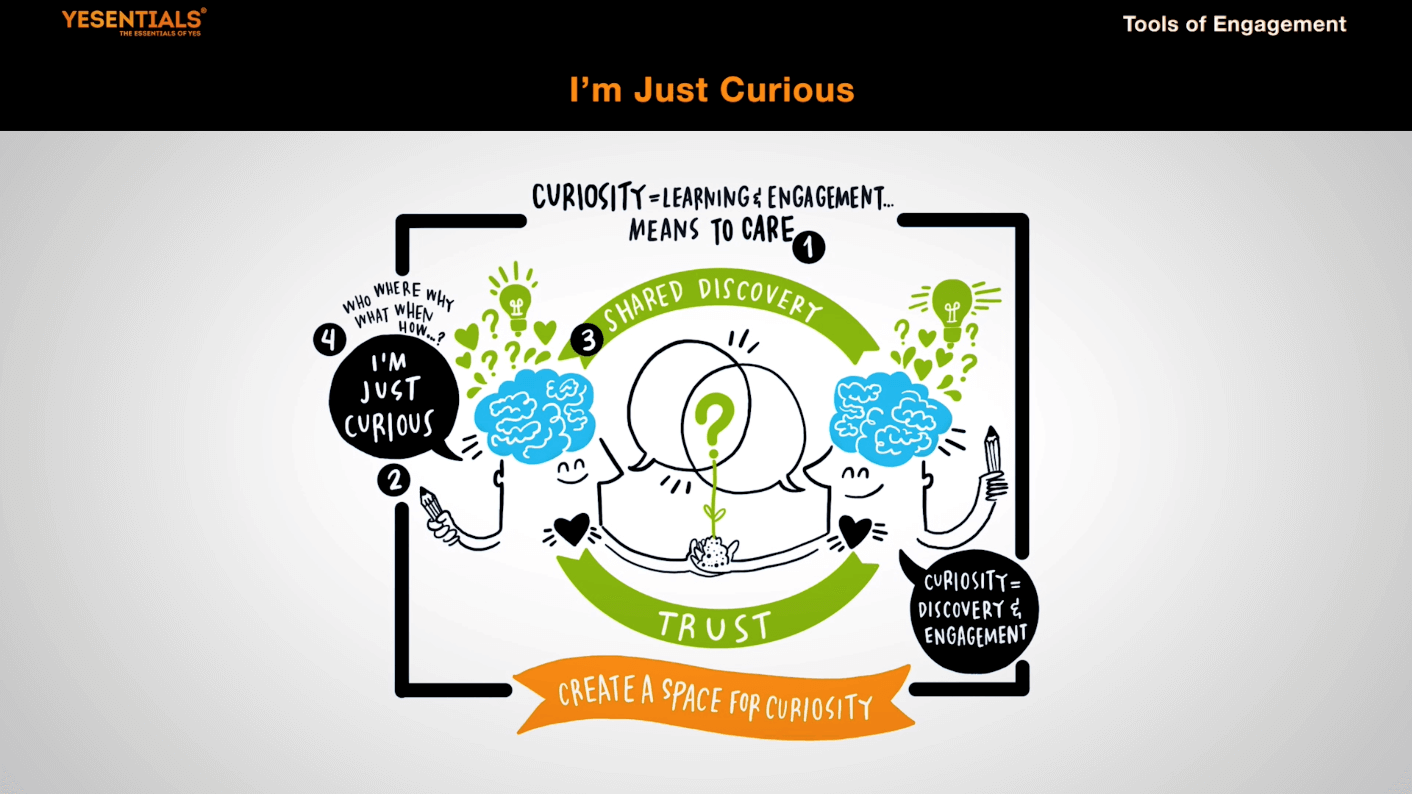 Research shows our brain releases dopamine when we ask questions, when we’re discovering something new, which makes us feel good, AND when we show curiosity about someone else, we trigger dopamine release in THEIR brain because our interest in them is felt as a compliment.  When curiosity is mutual it becomes SHARED DISCOVERY and increases five key components of engagement 1. Awareness 2. Participation  3. Confidence 4. Collaboration and ultimately 5. TRUST