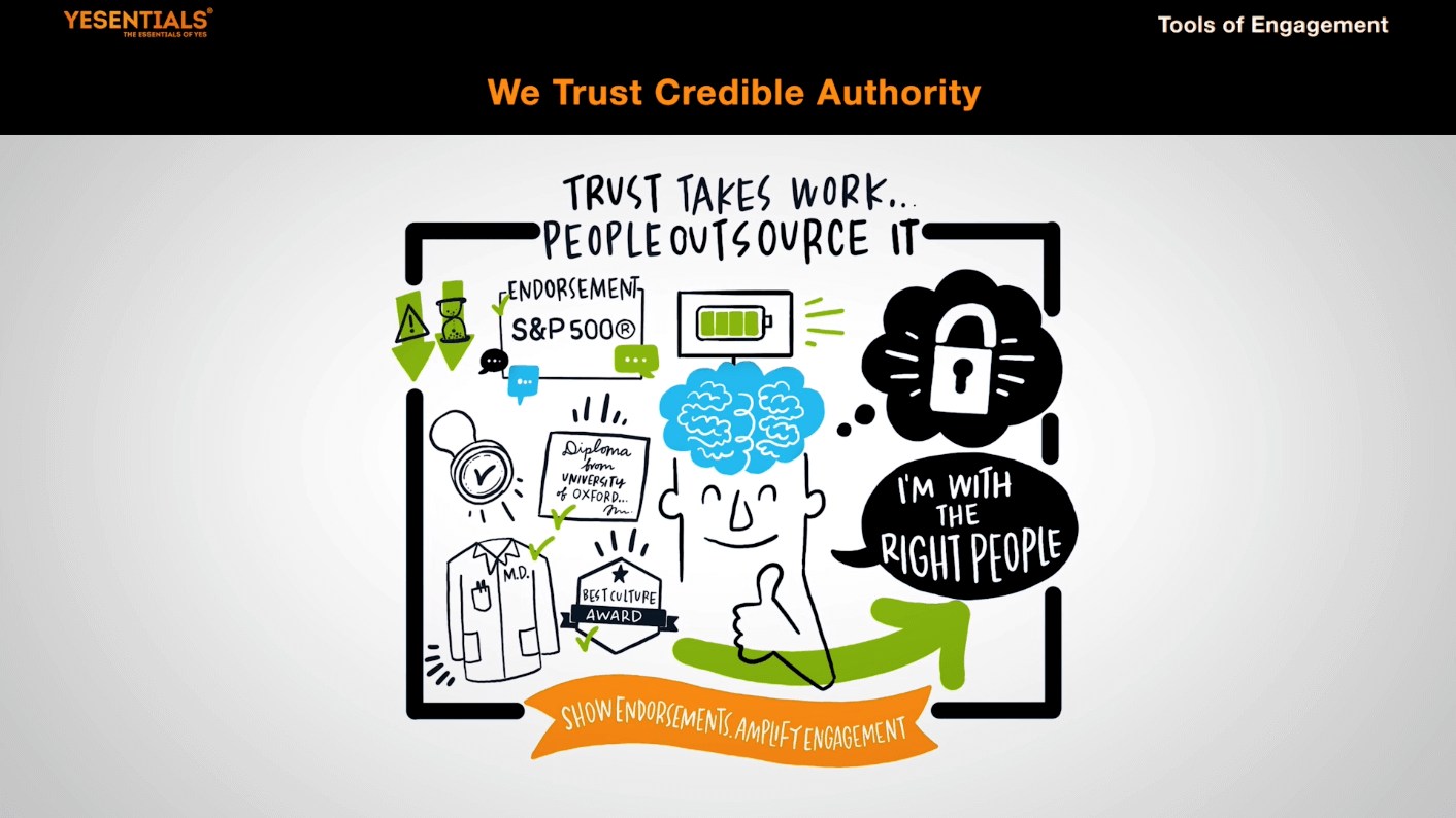 Humans look for back-up when making decisions. Before engaging with anyone we ask “Should we trust them?” Research shows we trust credible experts, those with THIRD PARTY ENDORSEMENTS such as a Diploma, a Uniform, or Award. With these “signals” of past achievement, expertise shows up in the present, indicating someone is worthy of our trust.