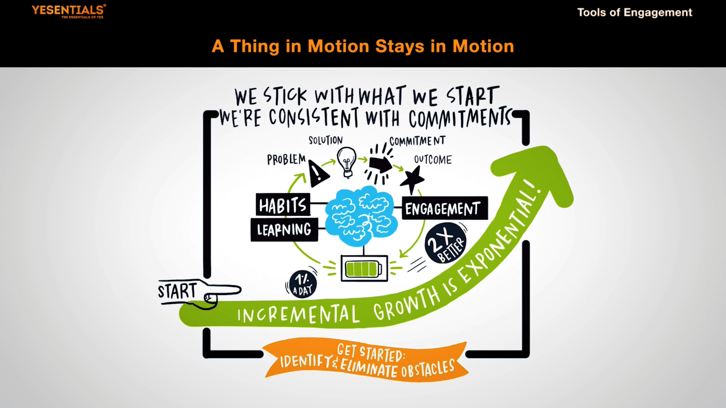 And forward motion starts when we start… momentum builds. It’s the way we do anything, the way we learn anything – little by little, then all at once: it’s the way we fall in love, learn to play an instrument, become skilled in a field. Research shows that learning and engagement start small and then it builds. The math is simple… improve 1% a day, every day, and in 70 days you’re twice as good… Incremental growth over time can be Exponential. To achieve any (1) outcome the brain burns energy to… identify a (2) problem then choose a (3) solution and finally to make a (4) commitment to move forward… from that point on it feels pressure to be consistent with that commitment… pressure from the Latin verb to press, meaning that some force is applied. Forward Motion is in and of itself a Forcing Mechanism